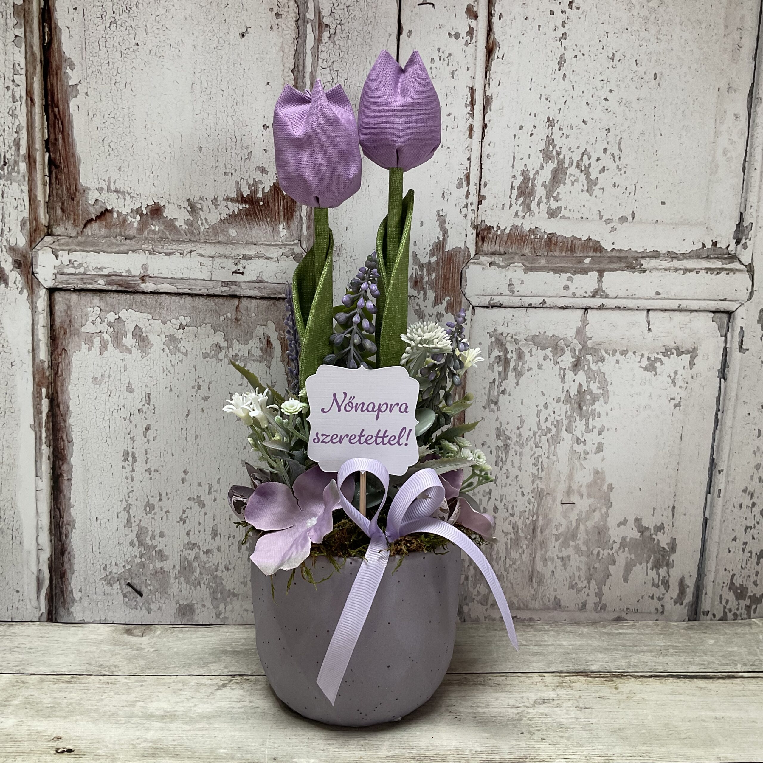 Egyedi tavaszi asztaldísz kerámia edényben textil tulipánokkal nőnapi kártyával.