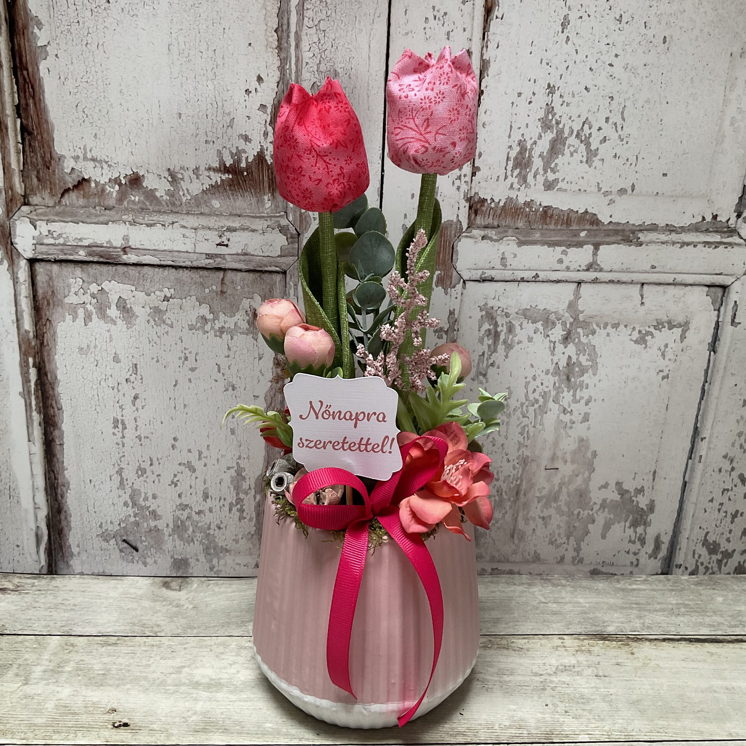 Egyedi tavaszi asztaldísz kerámia edényben textil tulipánokkal nőnapi kártyával.
